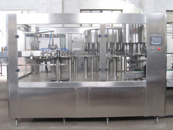 9.灌裝及封蓋:灌裝主要有無(wú)菌冷灌裝和無(wú)菌熱灌裝2種方式。果汁飲料灌裝為保證質(zhì)量往往采用無(wú)菌熱灌裝,要求:灌裝時(shí)的溫度不低于90℃,灌裝后瓶?jī)?nèi)溫度不低于85℃。灌裝后要馬上封蓋。封蓋時(shí)要調(diào)整封蓋頭合適的扭矩,確保封口嚴(yán)密。洗瓶、灌裝和封蓋三合一熱灌裝機(jī)。